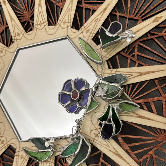 • Dans mon atelier, il prendra ses couleurs (céruse), sa personnalisation unique en vitrail (verre, cuivre, étain) et son miroir.