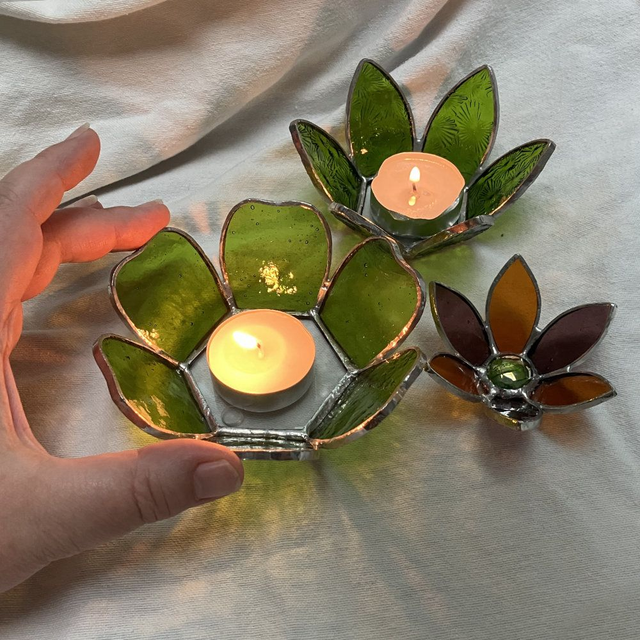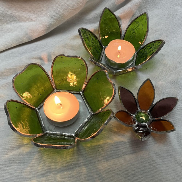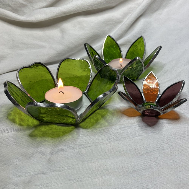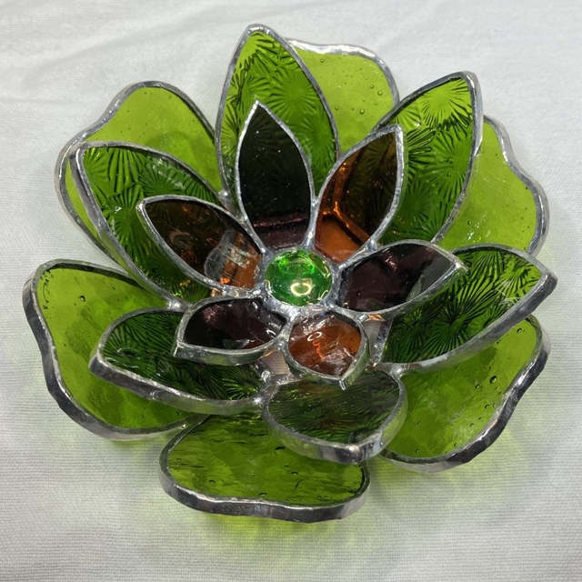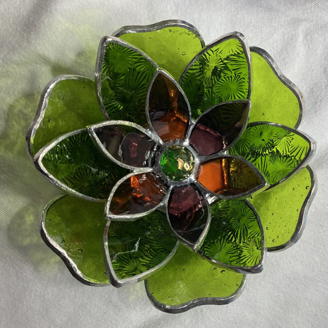 Réalisation en vitrail (technique Tiffany). Matière : Verres colorés dans la masse, cuivre et étain. Taille : entre 12 et 15 cm en fonction de la forme des pétales. Poids : entre 250 et 350 g.
