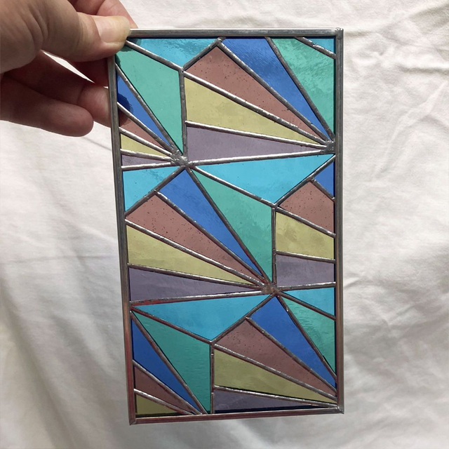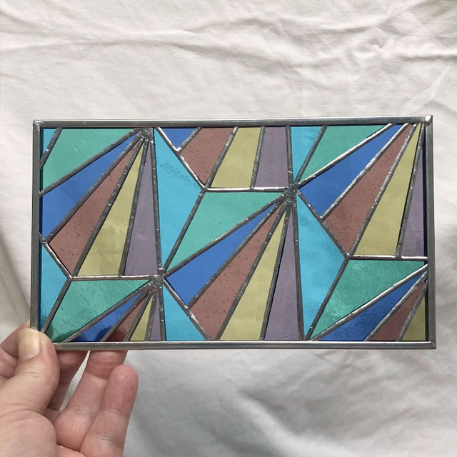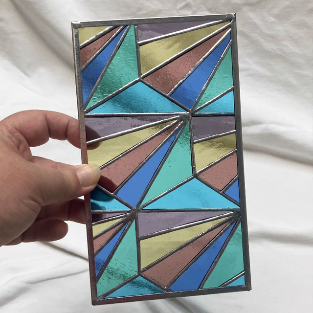 J'aime les motifs géométriques. C'est plus complexe à réaliser qu'il n'y paraît car il n'y a pas moyen de "se récupérer" en cas d'erreur et si l'on se trompe... On refait ! Alors, il faut prendre le temps de la précision et lorsque le travail est fini, le plaisir n'en est que plus intense. J'aime beaucoup ce vitrail aux couleurs tendres et si vous l'aimez aussi, profitez de cette proposition unique.