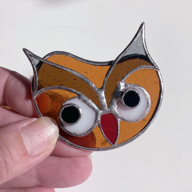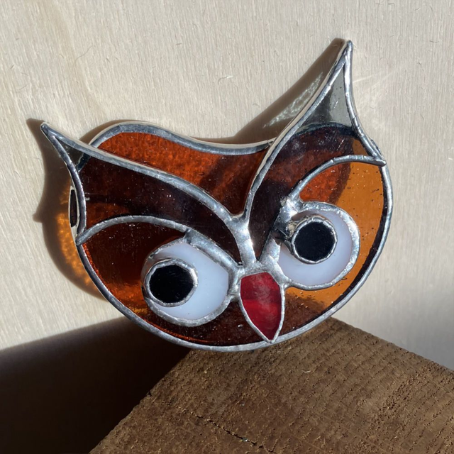 Chaque pièce est unique. Dimensions environ : 7 x 6 cm. Matières : Verres spéciaux pour vitraux teintés dans la masse, cuivre, soudure à l'étain. Fabriquée artisanalement en Isère. Ce modèle est une création "Éléna Rubies-Cérès-CRÉATIONS" (site Internet : les3angesdelena.fr)