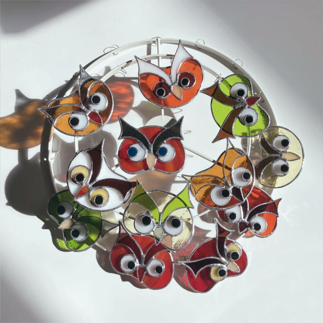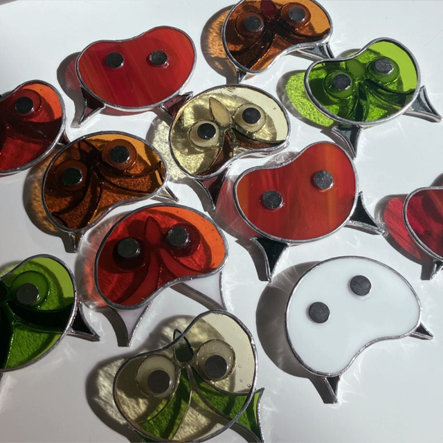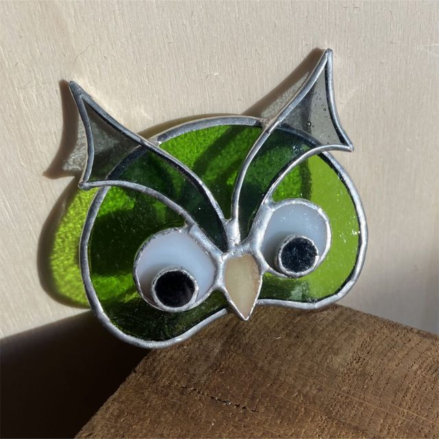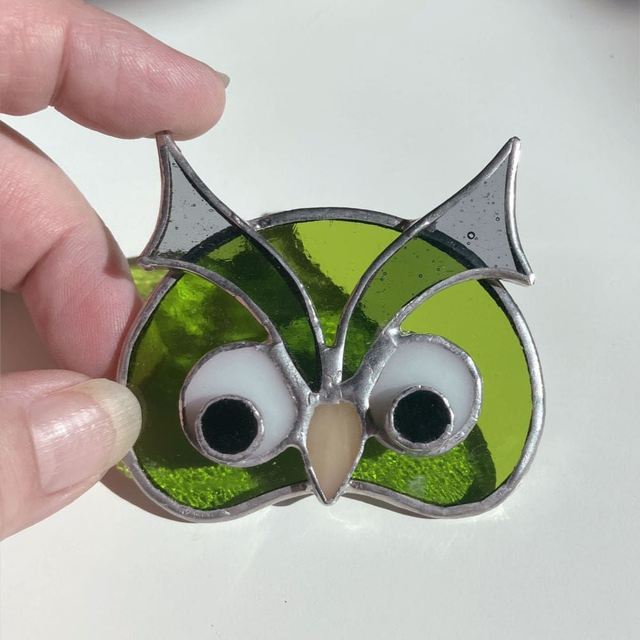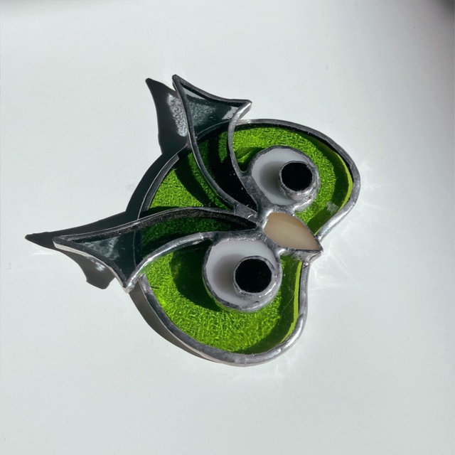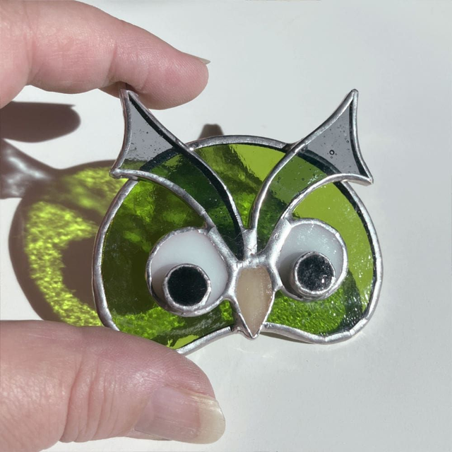 Chaque pièce est unique. Dimensions environ : 7 x 6 cm. Matières : Verres spéciaux pour vitraux teintés dans la masse, cuivre, soudure à l'étain. Fabriquée artisanalement en Isère. Ce modèle est une création "Éléna Rubies-Cérès-CRÉATIONS" (site Internet : les3angesdelena.fr)