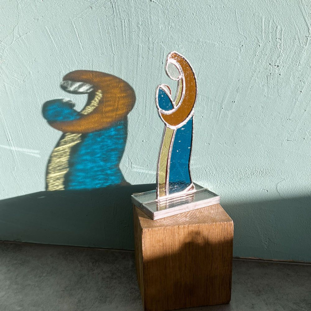 Dimensions support : 5 x 8 cm. Hauteur 15 environ. Matières : Verres spéciaux pour vitraux teintés dans la masse, cuivre, soudure à l'étain. Fabriquée artisanalement en Isère, cette figurine avec ou sans auréole est un modèle "Éléna Rubies-Cérès-CRÉATIONS" (site Internet : les3angesdelena.fr)